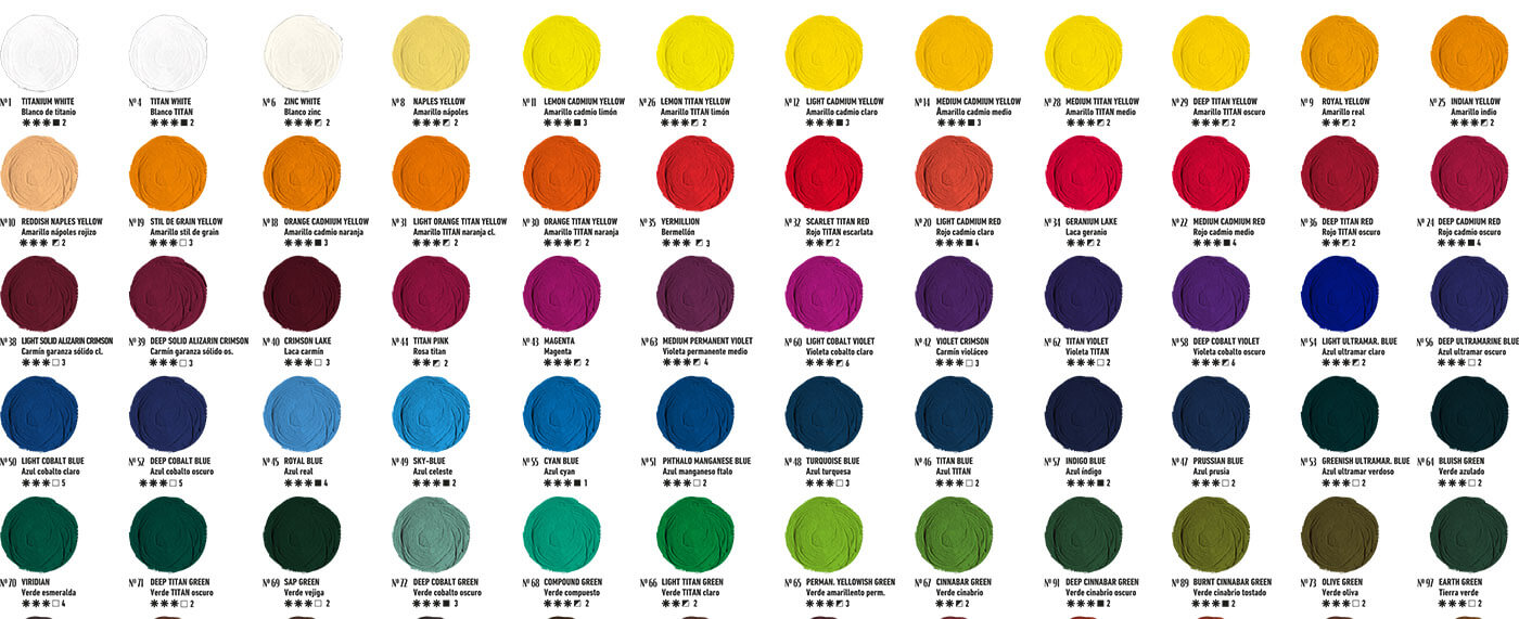 Entdecken Sie unsere Farbkarten von Titan Arts für Öl-, Acryl- und Aquarellfarben.